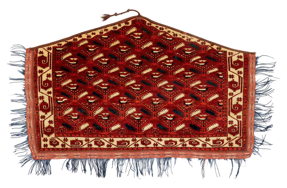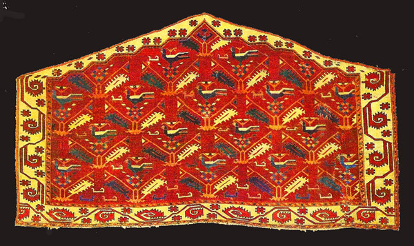 A Bird Asmalyk is a type of Turkmen asmalyk distinguished by motifs that resemble stylized birds. Asmalyks are pentagonal-shaped rugs used by Turkmen tribes as ceremonial decorations for camels during wedding processions. Bird asmalyks incorporate symbolic bird-like forms within their geometric patterns. These textiles are woven primarily by Turkmen tribes such as the Tekke and Yomut and represent an important ceremonial textile within Turkmen culture.