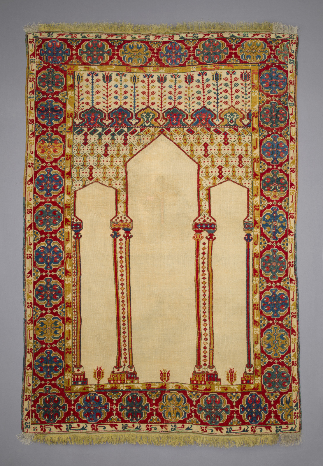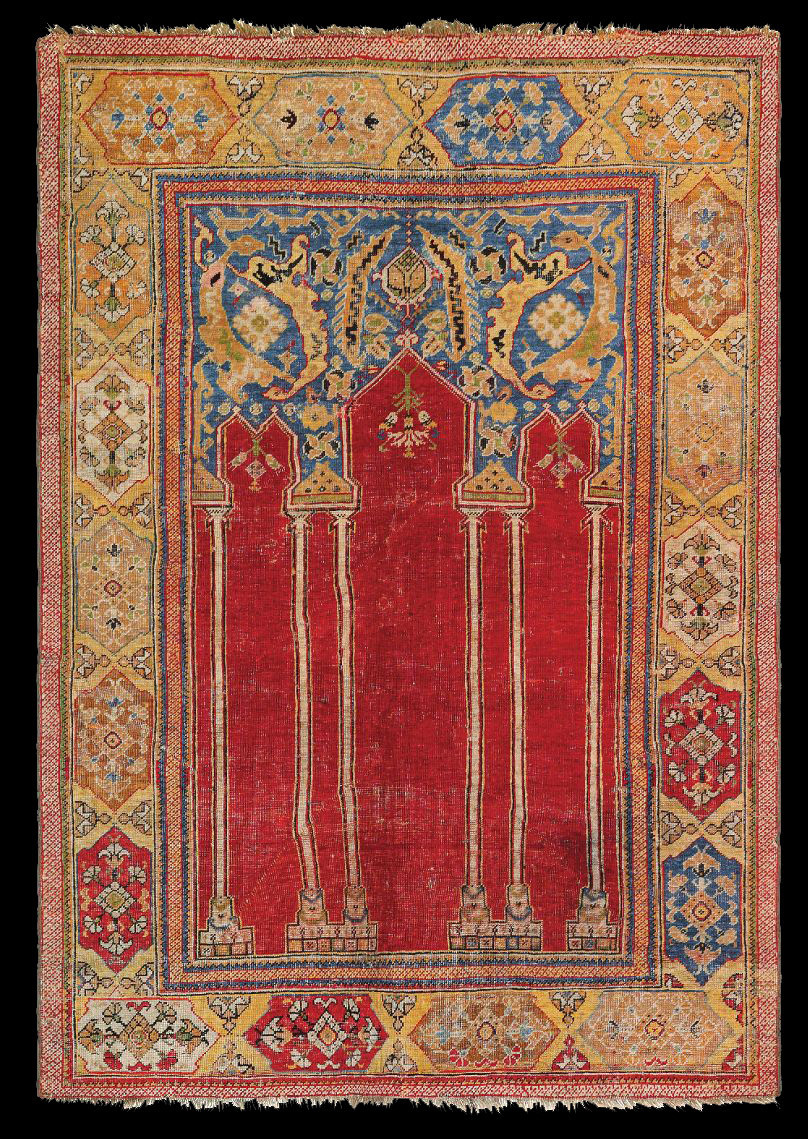 Coupled column prayer rugs are a type of early Anatolian prayer rug design characterized by two decorative columns supporting the prayer niche. These columns frame the mihrab, the architectural niche that indicates the direction of prayer in Islamic tradition. Coupled column designs are among the earliest recognizable formats in Anatolian prayer rug weaving. Prayer rugs from Oushak and other areas of Anatolia in which arches of the Mihrab are supported by pairs of columns rather than by single columns. This design may have evolved into vertical panel prayer rugs. Many of the coupled prayer rugs have lazy lines. You may also find Ladik rugs with similar concept as shown below.