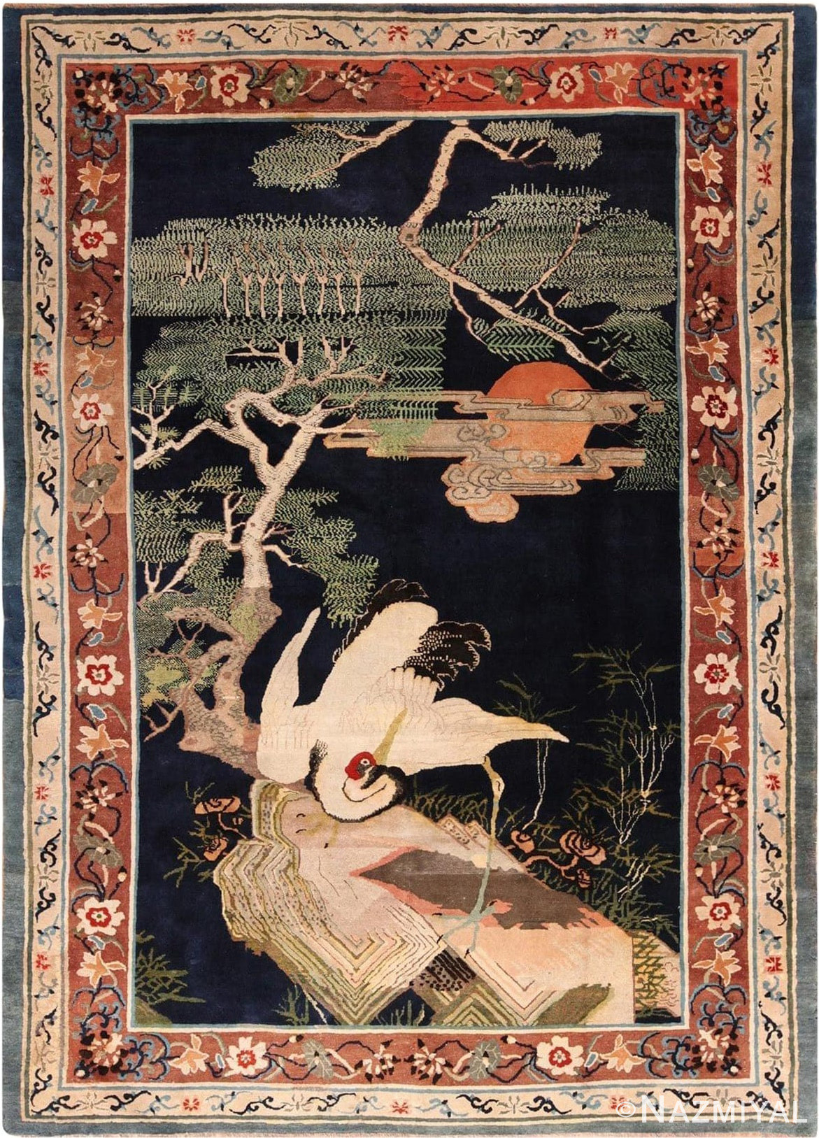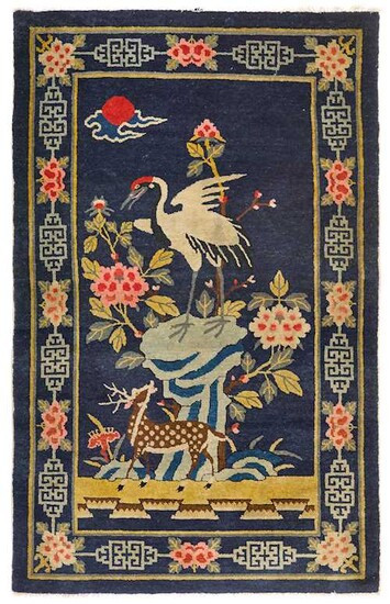 The crane is a symbolic motif frequently found in Chinese carpets and textiles. In Chinese culture, the crane represents longevity, wisdom, and immortality. It is often depicted standing among clouds or natural landscapes within decorative compositions. The crane motif appears in many forms of Chinese decorative art. The carne is a symbol of long life and is used in Chinese rug designs. It was also the emblem of first degree officials in the Manchu court.