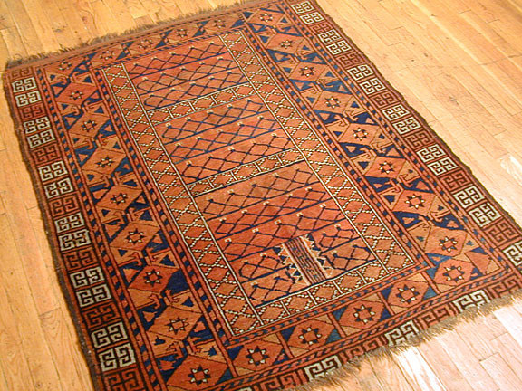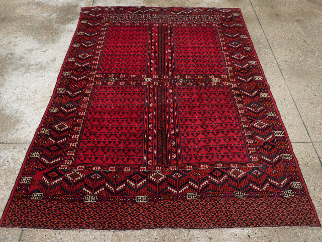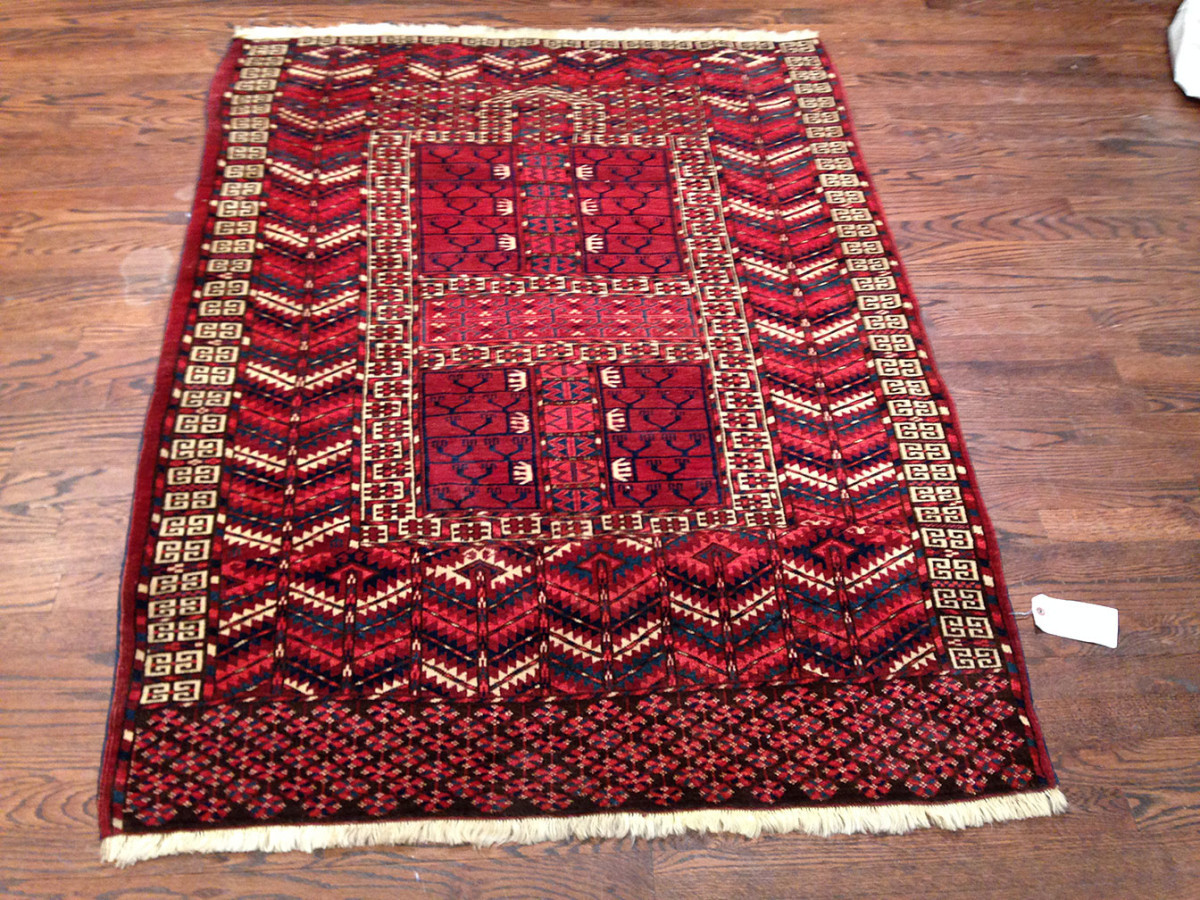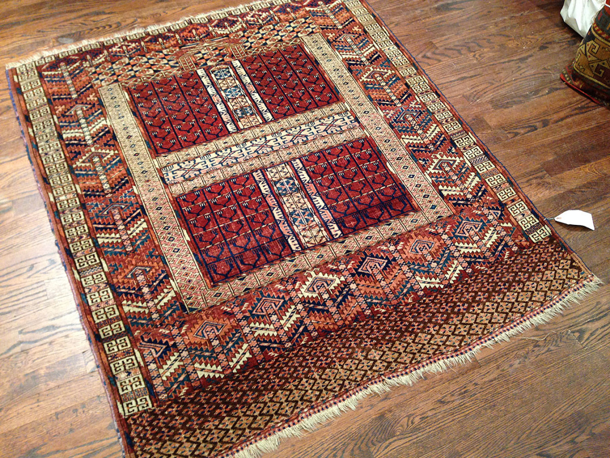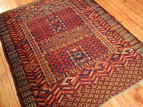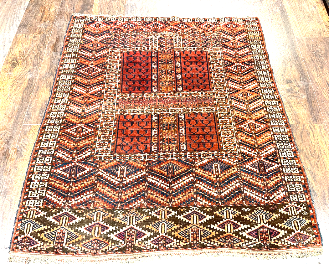 An Engsi is a type of Turkoman rug traditionally used as a door hanging for a nomadic tent (yurt). The rug is typically divided into several panels by horizontal and vertical bands that form a design resembling a doorway or lattice structure. Engsis were placed at the entrance of the tent and served both a practical and decorative purpose. These rugs were woven by various Turkmen tribes, including the Tekke, Yomut, and Ersari. Engsi is a Turkish word for curtain, and this term is used to identify rugs made by Turkoman tribes to cover the entrance to their tents. As a tradition most of these items were made in a four compartment style that will create a cross shaped center called
