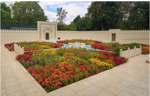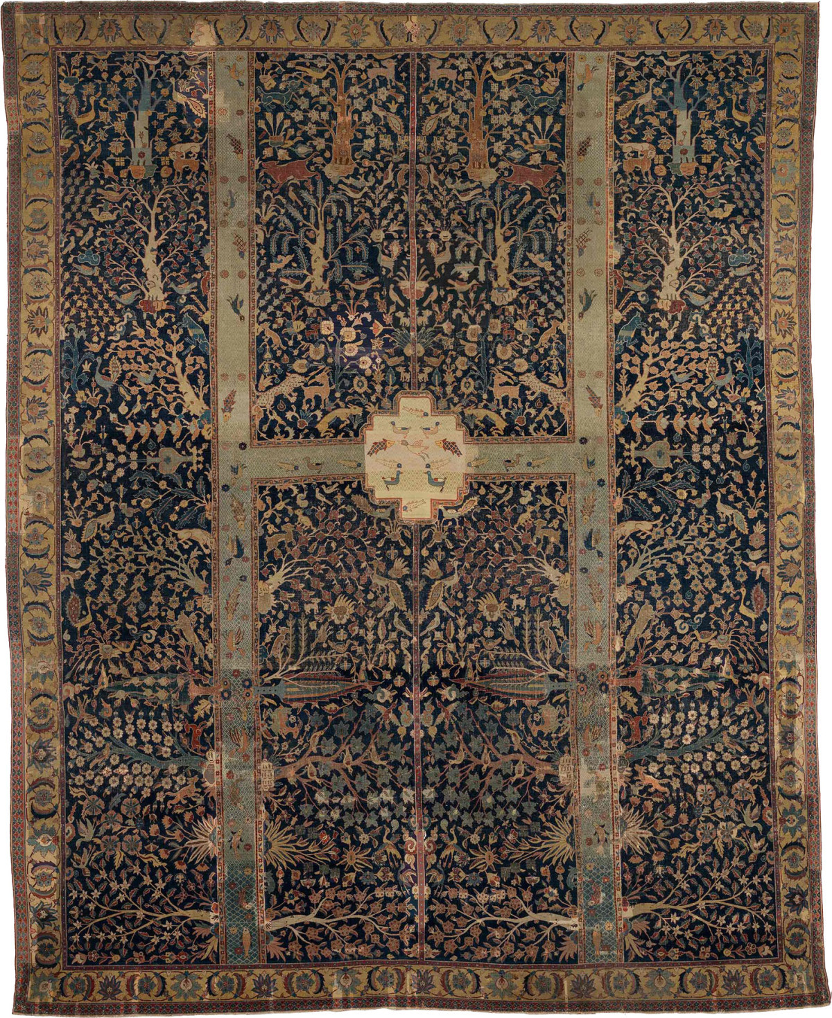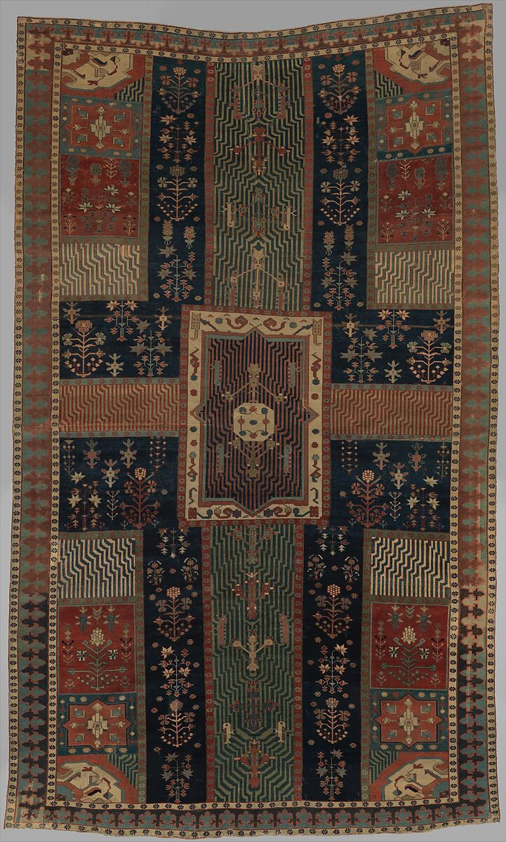 Garden carpets are oriental rugs designed to resemble a formal garden divided into compartments, often symbolizing the paradise gardens described in Persian and Islamic tradition. The field of the carpet is usually divided into rectangular panels containing flowers, trees, water channels, or other garden imagery. Garden carpets are particularly associated with Persian and Mughal Indian carpet traditions. Carpets with rectangular components containing floral motifs. The earliest of such carpets from the 17 Century represented Safavid gardens. Their compartments are elaboration of Chahar Bag, the quartered garden. The compartments are delineated by rectangular water courses, often containing fish and water fowl. There are rectangular pools or reservoirs at major intersections of the channels. Early garden carpet designs are highly variable, but a group of consistent designs is attributed to Kurdistan of about 1800.