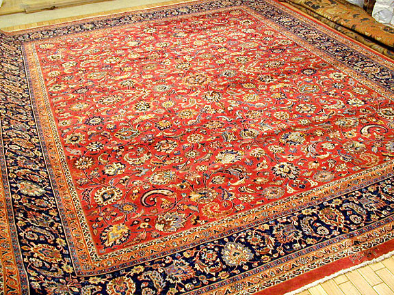 Meshed, famous for the holy shrine of the eighth Imam Reza, is the capital of Khorasan, a province situated on the northeastern part of Iran (Persia). During the 16th and 17th Centuries Khorasan was one of the leading centers of weaving in Persia, with carpets produced in workshops and villages throughout the province. After a period of decline, at the beginning of this century dealers from Tabriz established a number of factories in the city and brought in weavers to work there. Since the local dealers used the Persian knot and the new weavers introduced the region the Turkish knot, you can find both techniques in Meshed carpets. As an unusual practice few rugs were woven and the city became known for its large and oversized carpets. Well-proportioned central medallion designs were very popular, and were valued for their elegant curves and intricate arabesques.