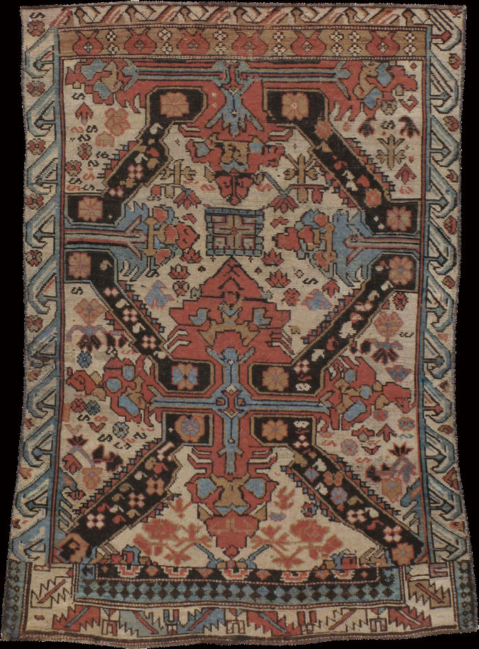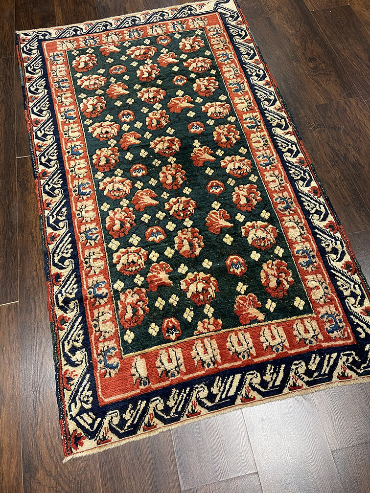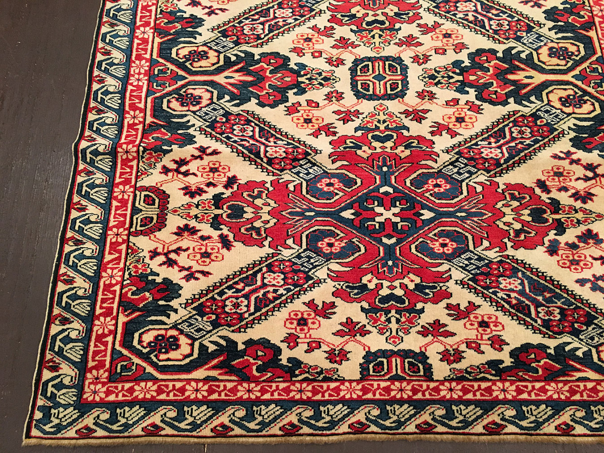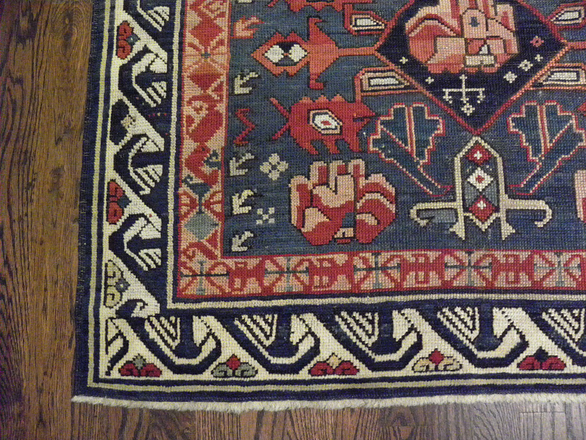 The running dog border is a common decorative motif found in Caucasian rugs, consisting of a continuous, angular geometric pattern that resembles a sequence of stylized running animals. This border design is widely used to frame the central field of the carpet and is characteristic of many Caucasian weaving traditions. It adds movement and rhythm to the overall composition of the rug. The term is used to describe a border of repeated waved shapes, similar to a Vitruvian scroll. In some interpretations, it is a reciprocating border. Geometrical versions may be termed