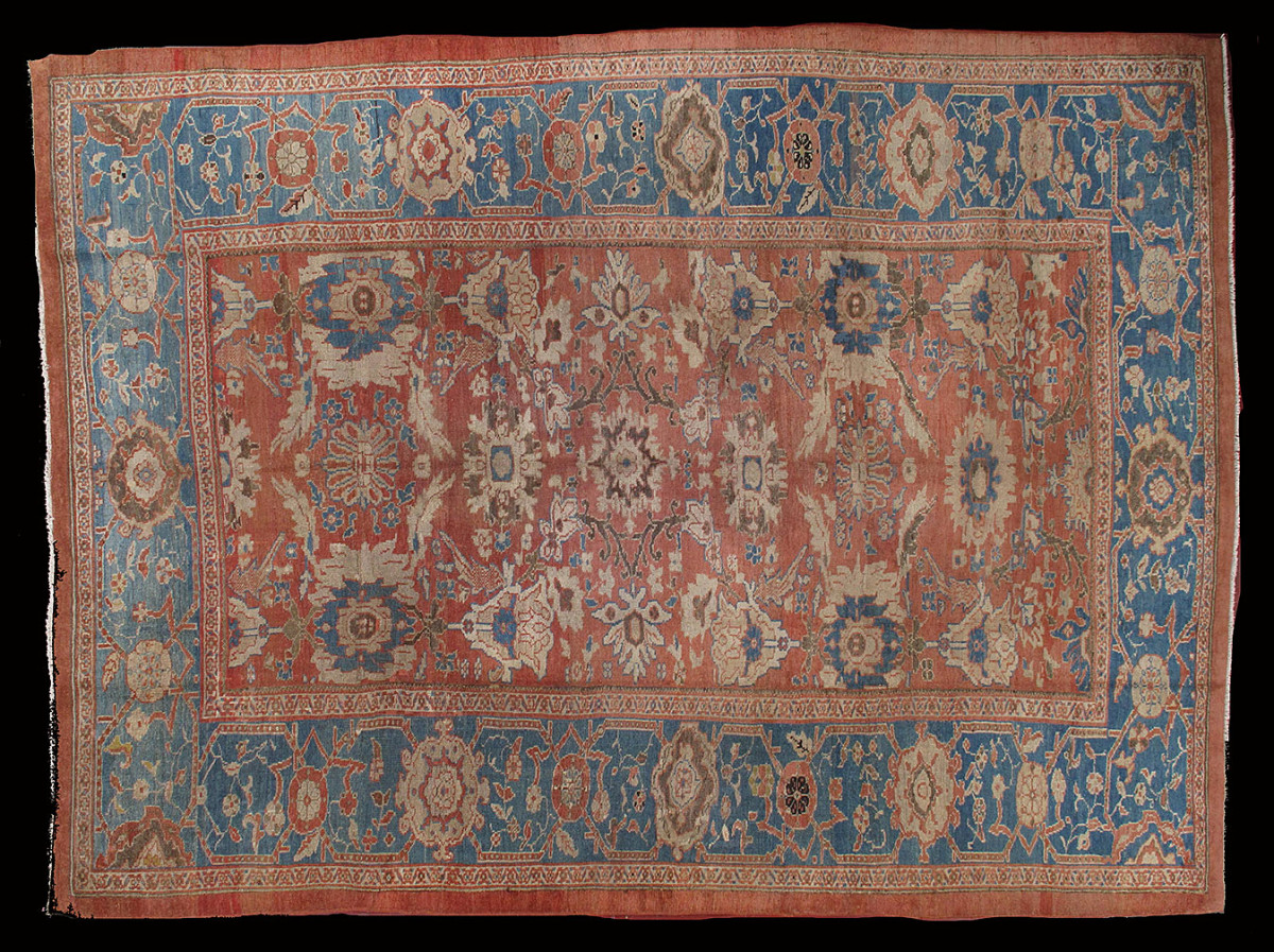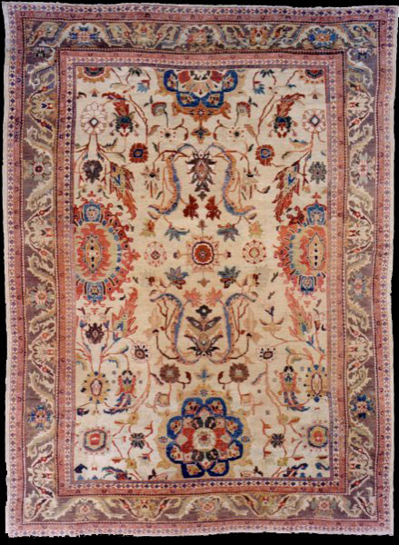 These carpets are known for their large-scale floral designs, open patterns, and soft color palettes, often produced for export markets in the late 19th century.