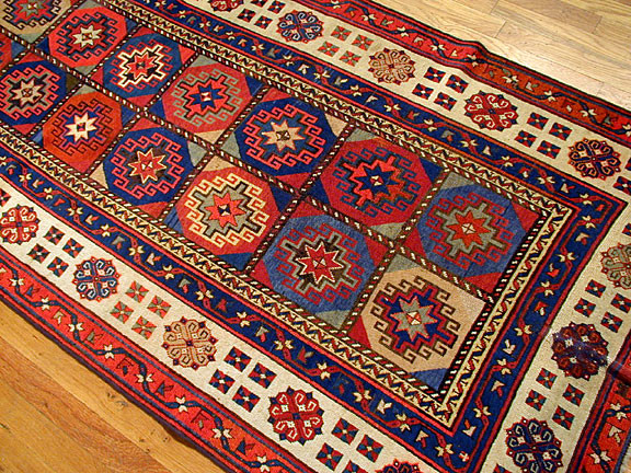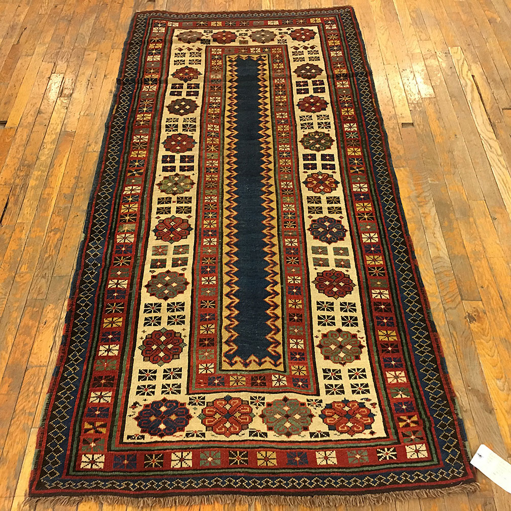 Talish rugs are a type of Caucasian carpet associated with the Talish region, located along the southwestern coast of the Caspian Sea in Azerbaijan. These rugs are often characterized by elongated formats, simple geometric designs, and strong colors, reflecting regional village weaving traditions. Talish carpets are valued for their distinctive proportions and tribal character. Talish rugs are easily recognizable by their long, narrow shape and distinctive design. They are woven by Tartars nomads with the greatest skill in rug making of all Caucasian people. The main border is always stylized in a very distinguished manner. The Talish rugs with the plain solid field are the most favored by collectors.
