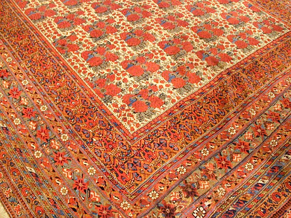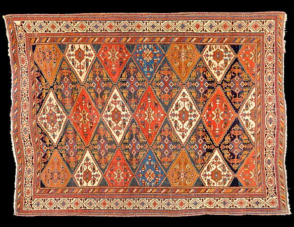 Patterns are mostly geometric. A design of one or two rhombi within an enlarged hexagon is common. Motifs of boteh (paisley) Cypresses and Tree of Life are also popular. Colors are generally harmonious and subdued.