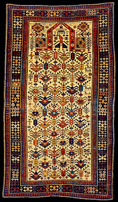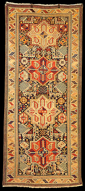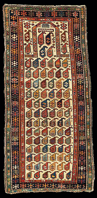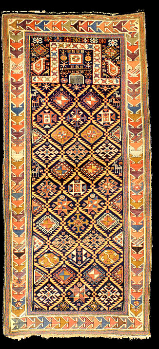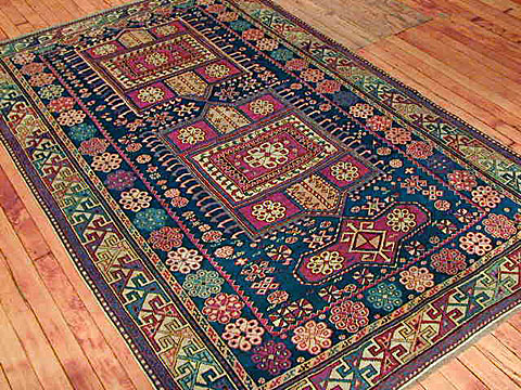 Akstafa rugs are very similar to Shirvan rugs with the unique Akstafa peacock elements, which are geometricized birds with an elaborate tail. This motif is rarely found in some Anatolian rugs.