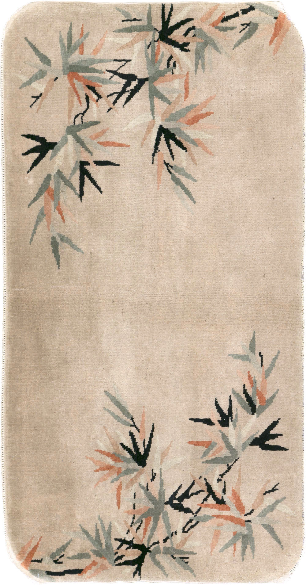 Bamboo is a symbolic motif commonly found in Chinese decorative arts, including carpets and textiles. In Chinese symbolism, bamboo represents strength, resilience, and longevity because the plant bends without breaking. In Chinese rug designs, bamboo may appear as stylized stalks or leaves incorporated into landscape or decorative patterns. Bamboo is sometimes depicted in Chinese rugs. As a Taoist symbol, a bamboo tube is shown wrapped by a ribbon and containing several wands. It may be shown in a full leaf as a motif in modern rugs. Generally, bamboo symbolizes endurance, the ability to bend without breaking.