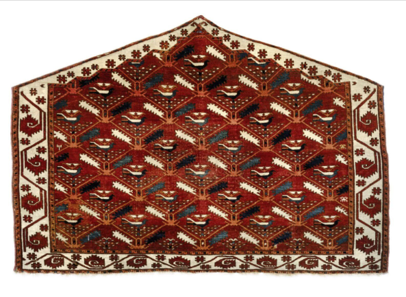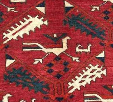 A Bird Asmalyk is a type of Turkmen asmalyk distinguished by motifs that resemble stylized birds. Asmalyks are pentagonal-shaped rugs used by Turkmen tribes as ceremonial decorations for camels during wedding processions. Bird asmalyks incorporate symbolic bird-like forms within their geometric patterns. These textiles are woven primarily by Turkmen tribes such as the Tekke and Yomut and represent an important ceremonial textile within Turkmen culture.