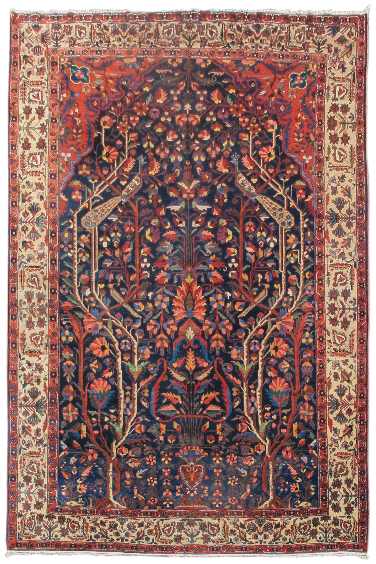 Rugs from this region often feature the well-known garden panel design, where the field is divided into compartments containing stylized flowers, trees, and decorative motifs.