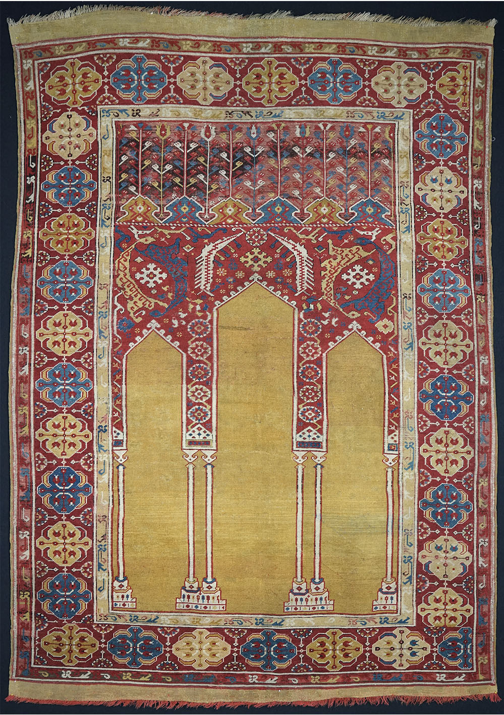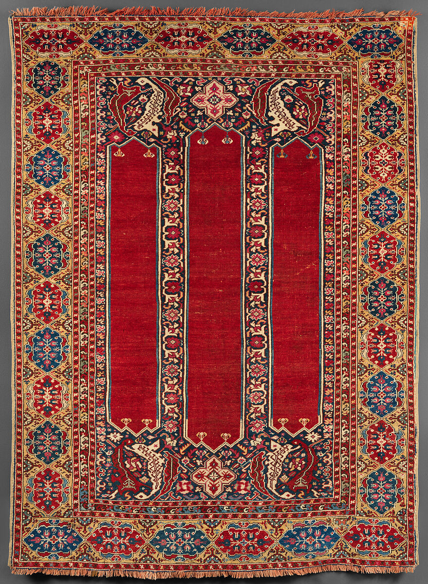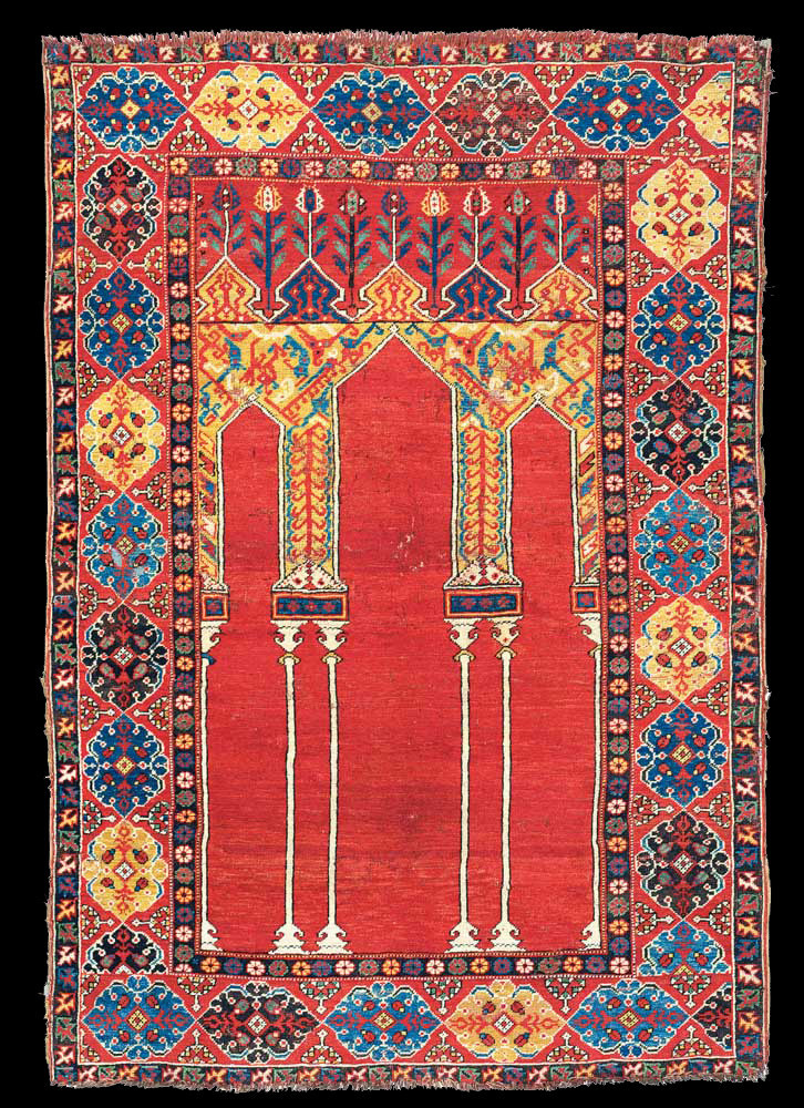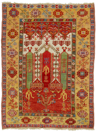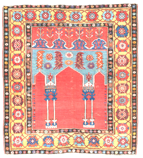 Coupled column prayer rugs are a type of early Anatolian prayer rug design characterized by two decorative columns supporting the prayer niche. These columns frame the mihrab, the architectural niche that indicates the direction of prayer in Islamic tradition. Coupled column designs are among the earliest recognizable formats in Anatolian prayer rug weaving. Prayer rugs from Oushak and other areas of Anatolia in which arches of the Mihrab are supported by pairs of columns rather than by single columns. This design may have evolved into vertical panel prayer rugs. Many of the coupled prayer rugs have lazy lines. You may also find Ladik rugs with similar concept as shown below.