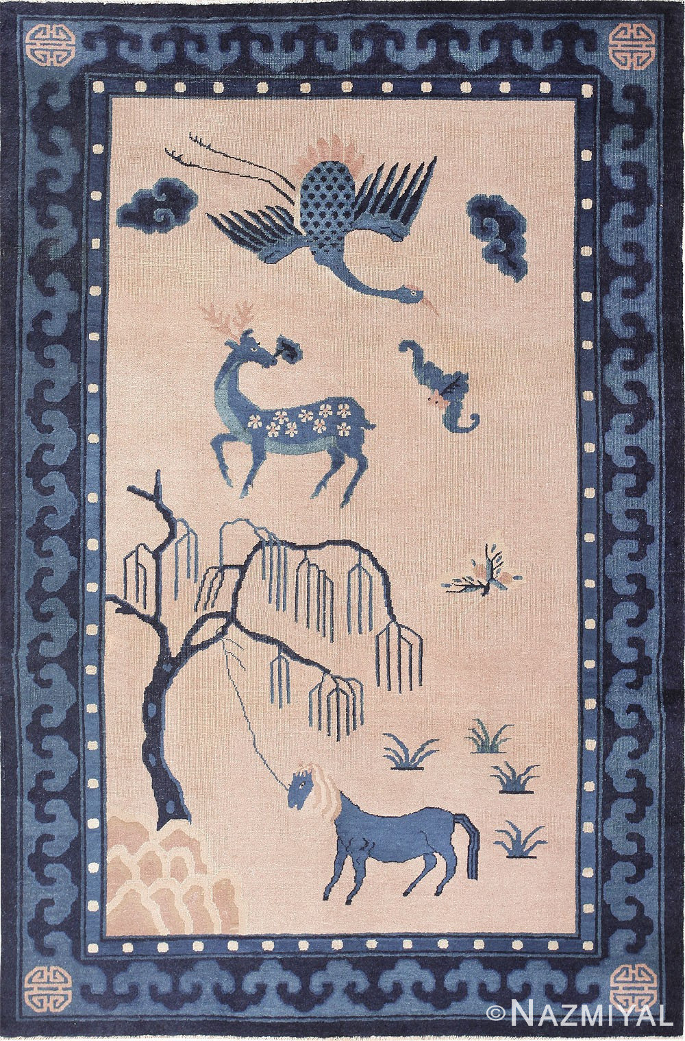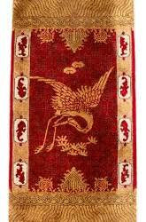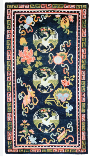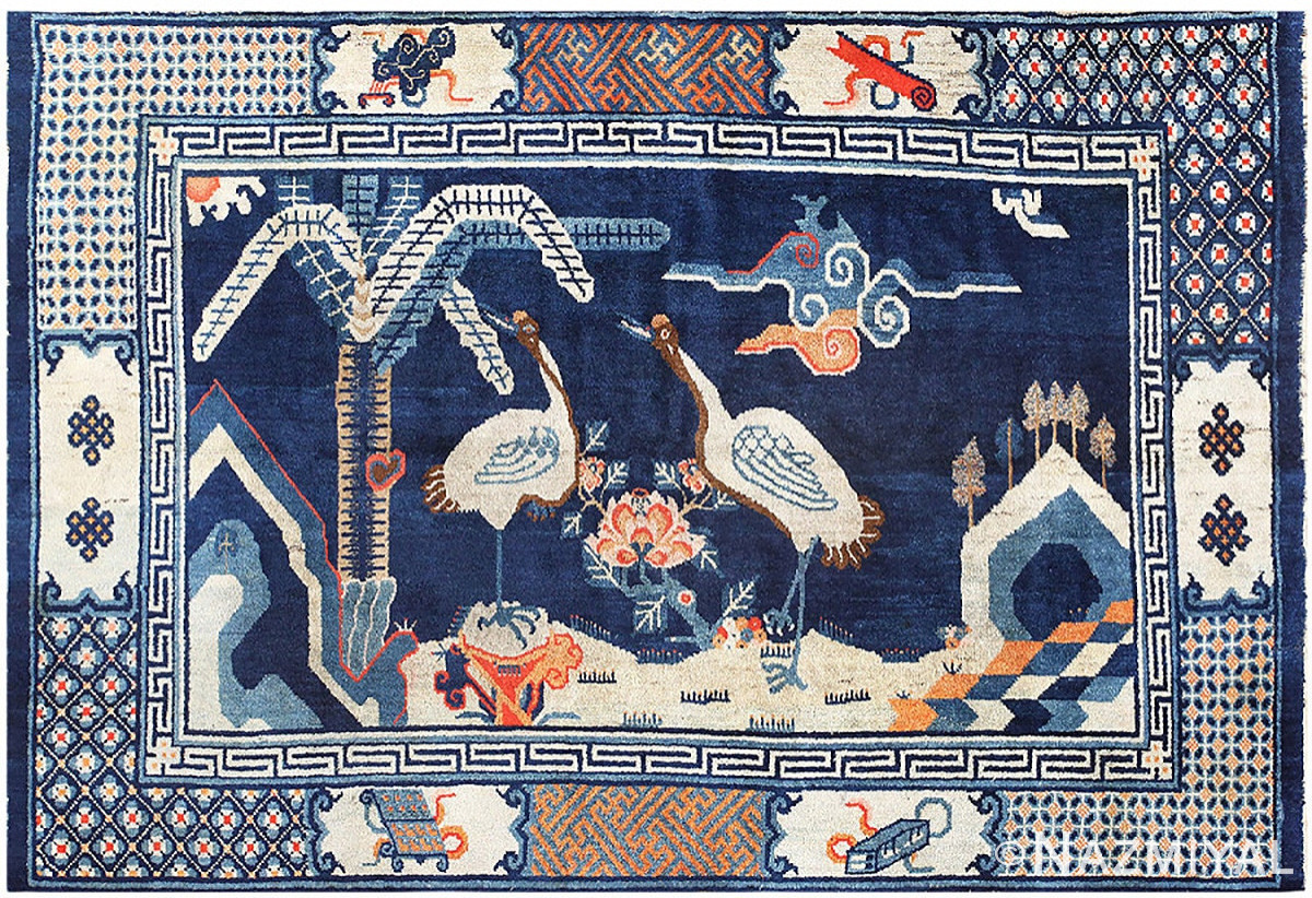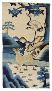 The crane is a symbolic motif frequently found in Chinese carpets and textiles. In Chinese culture, the crane represents longevity, wisdom, and immortality. It is often depicted standing among clouds or natural landscapes within decorative compositions. The crane motif appears in many forms of Chinese decorative art. The carne is a symbol of long life and is used in Chinese rug designs. It was also the emblem of first degree officials in the Manchu court.