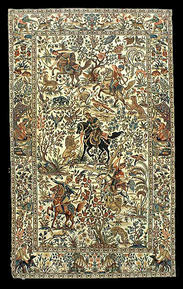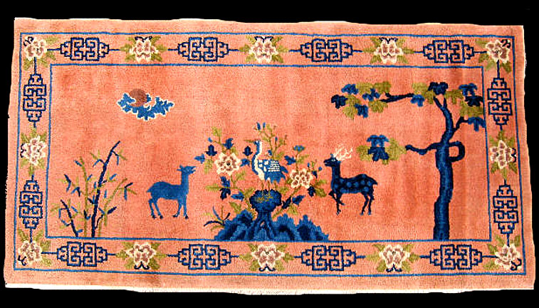 Images of deer are used in rugs of Persia and India mostly in hunting design items. In Chinese rugs the image of deer may suggest longevity or wealth.