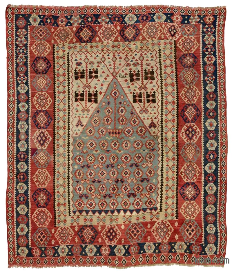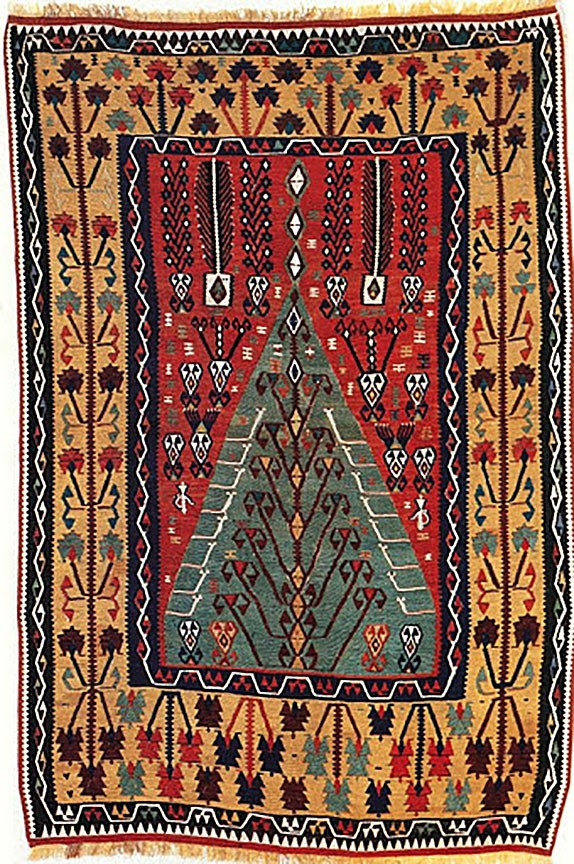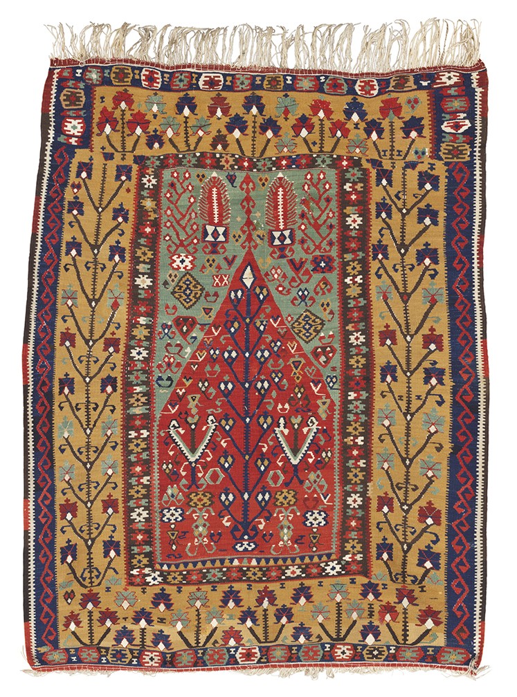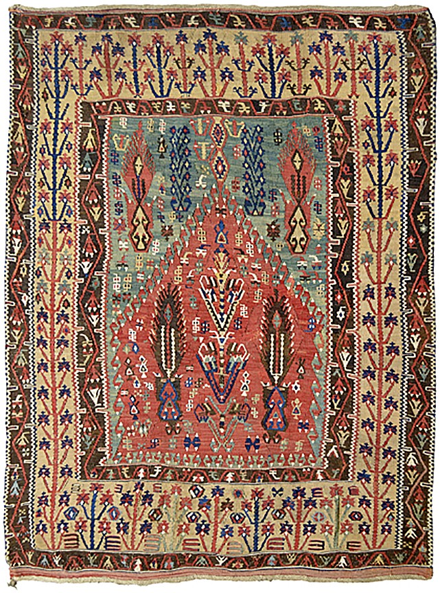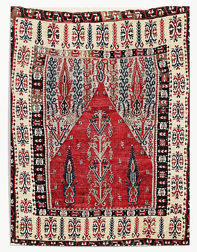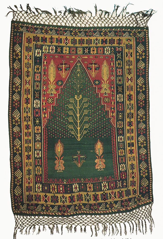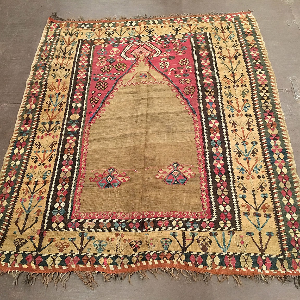 Erzurum is a town in Easter Anatolia, southwest of Kars. It serves as a collecting point for eastern Anatolian village and nomadic rugs. Erzurum itself a source of kilims. These are small prayer kilims with pointed and stepped mihrabs and multiple borders.