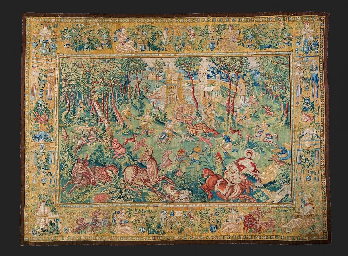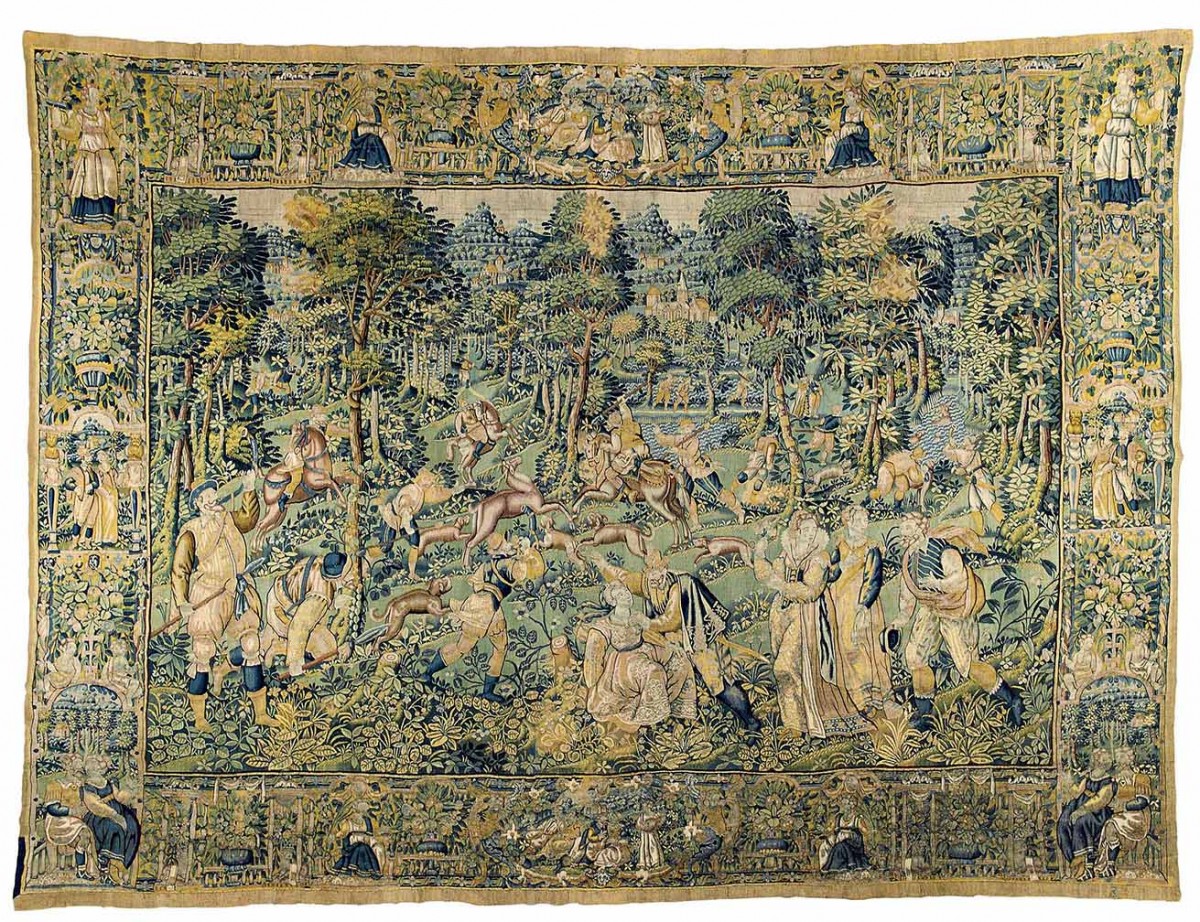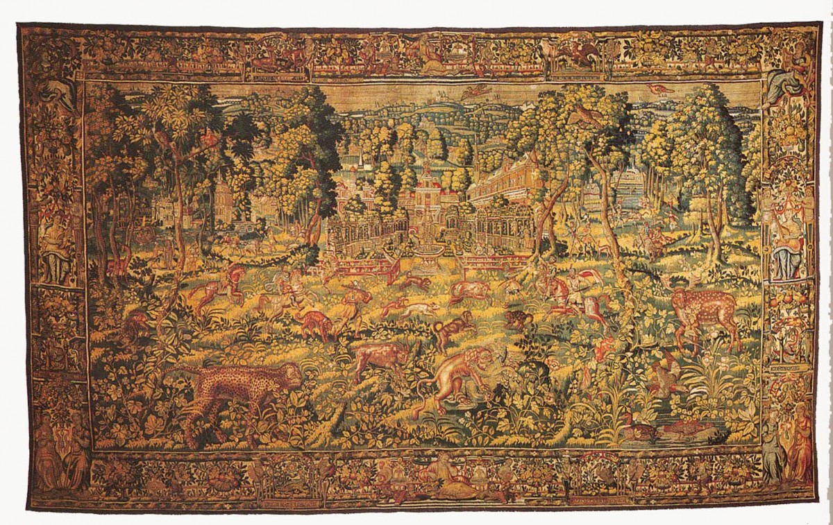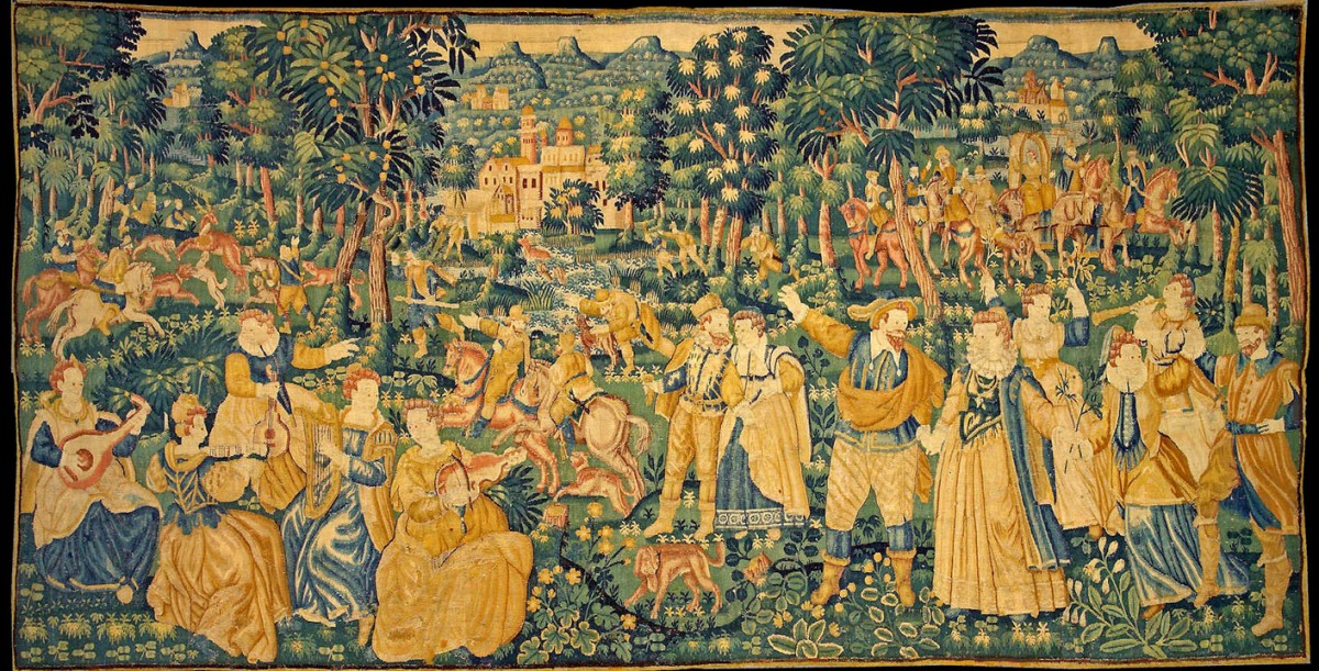 These small figure designs of Game Park tapestries were woven throughout northern Europe by this date and were woven by Southern Netherlandish weavers, including anonymous weavers in London, Frans Spiering who relocated from Antwerp to the northern Netherlands, and there were others in Brussels, Enghien and Oudenaarde. They often had elaborate deep borders, incorporating allegorical figures in architectural niches, alternating with fruit and flowers. The quality of the weave varied from one weaving centre to the other. The subjects could be mythological or secular. With the importance of garden design at this time, they were often depicted as formal arrangements in these landscape settings with the elegantly dressed figures in the foreground.