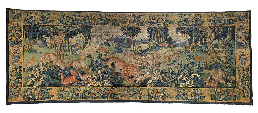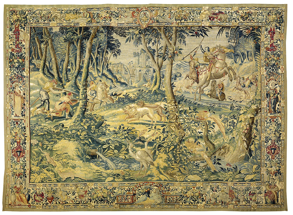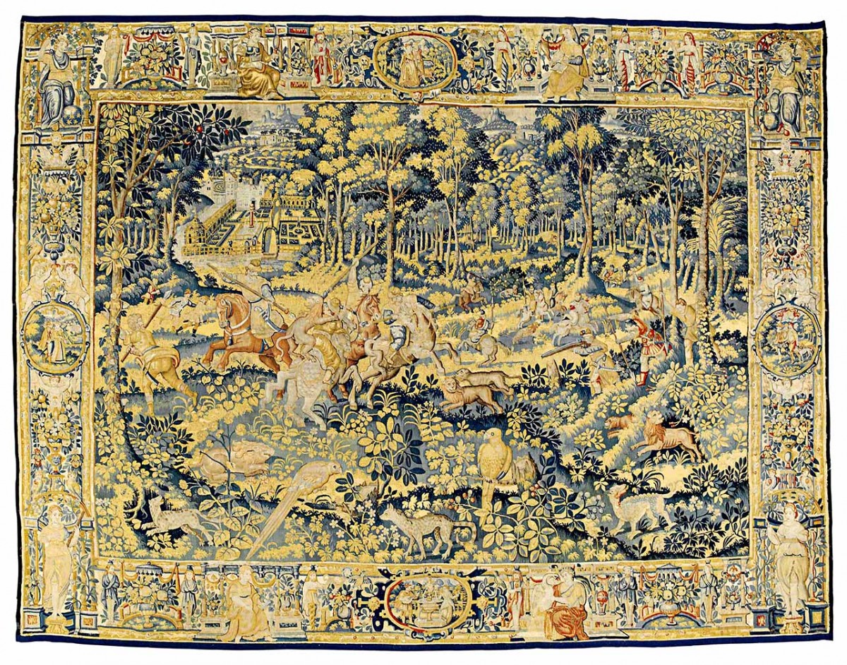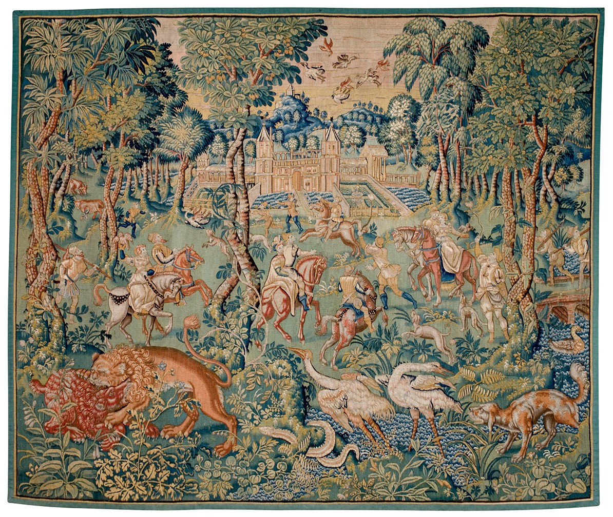 These small figure designs of Game Park tapestries were woven throughout northern Europe by this date and were woven by Southern Netherlandish weavers, including anonymous weavers in London, Frans Spiering who relocated from Antwerp to the northern Netherlands, and there were others in Brussels, Enghien and Oudenaarde. They often had elaborate deep borders, incorporating allegorical figures in architectural niches, alternating with fruit and flowers. The quality of the weave varied from one weaving centre to the other. The subjects could be mythological or secular. With the importance of garden design at this time, they were often depicted as formal arrangements in these landscape settings with the elegantly dressed figures in the foreground.