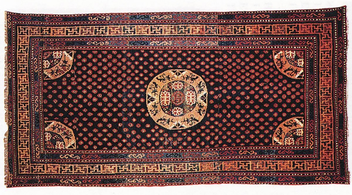 Kansu is a province in China that includes the city of Ninghsia. The major weaving center is Ninghsia, but rugs were woven in many smaller towns. Generally, rugs of Kansu are coarsely woven in comparison to Ninghsia. Designs are usually rendered in blue on yellow, light red or tan fields. Some Kansu rugs have wool weft.