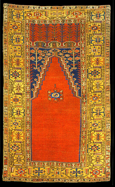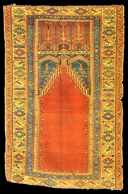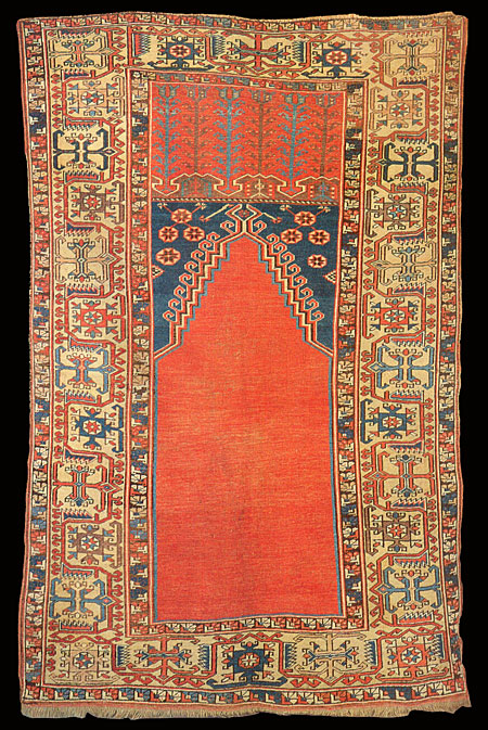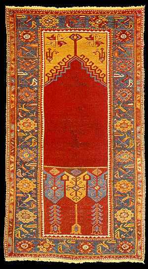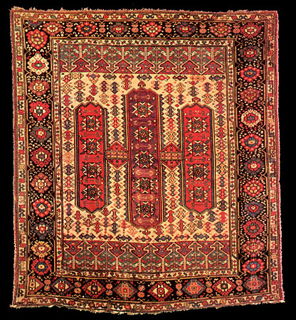 Ladik is a town located in Central Anatolia north of Konya. As many other Turkish rugs the prayer design is the most common in Ladik Rugs. The most distinguished character of the Ladik rugs is the panel of Tulips that spring downward from below the Mihrab.