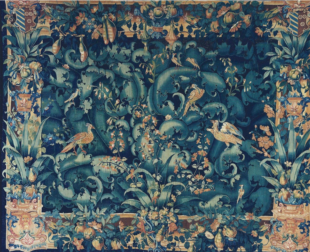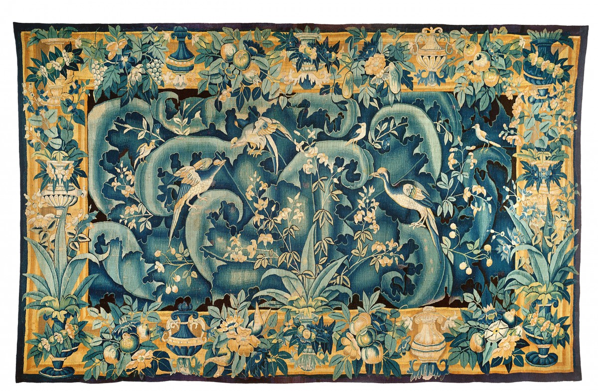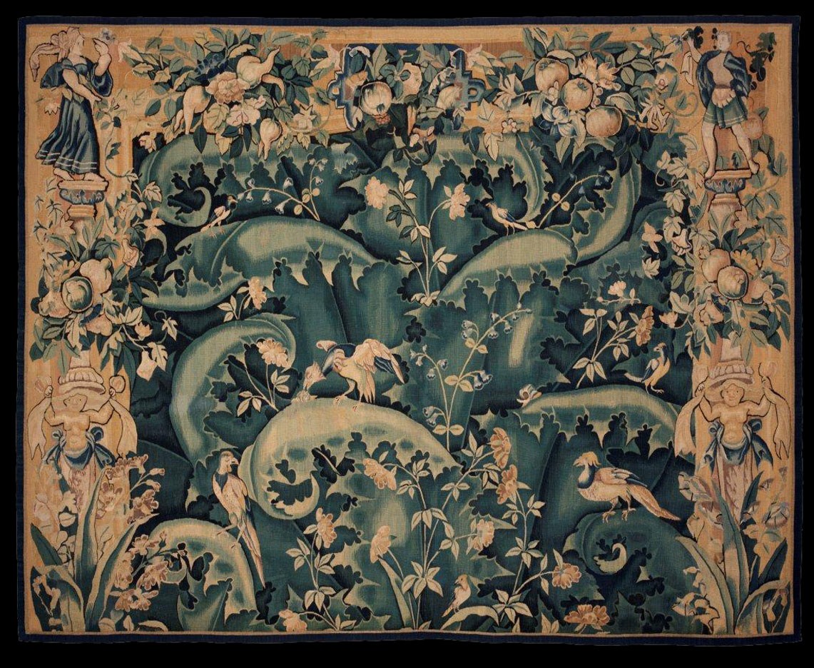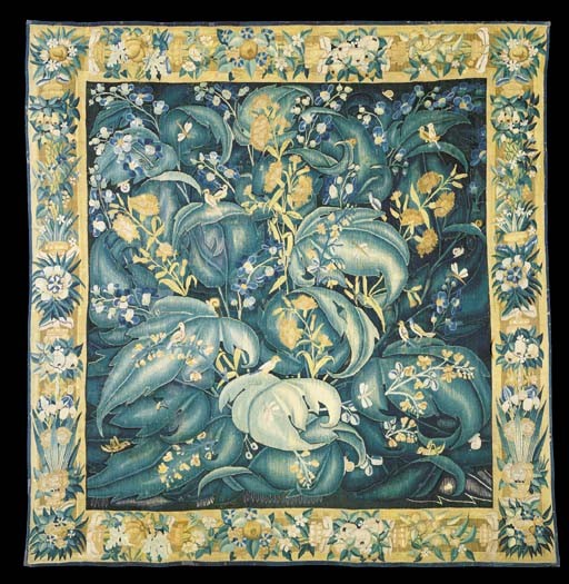 FEUILLES DE CHOUX TAPESTRIES ORIGINS 'Feuilles de choux' tapestries, so-called because of the mass of huge cabbage-like leaves dominating their fields, are among the most striking and mysterious of all tapestries. Their design borders on the abstract, a profusion of wild foliage seemingly emerging from darkness with a visual dynamism particularly in tune with the modern eye. While the origins of these powerful images are unclear, their impact remains undimmed. Tapestries dominated by a background of flowers and foliage but in a more ordered, classical framework are recorded as early as 1430 in an inventory for Philip the Good where one tapestry is described 'de fil d'Arras, à plusieurs herbages et fleurettes, ouvré au mylieu de deux personnages, assavoir d'un chevalier et d'une dame, et de six personnages d'enfants'. One of the earliest and grandest surviving examples, however, is in the Bernisches Historisches Museum, Berne, and depicts the arms of Philip the Good flanked by stags on a millefleurs background and was woven by Jan de Haze in Brussels in circa 1466. Here the flowers are largely symbolic and represent a type of Garden of Eden on which the Duke's arms are displayed. The wilder, more untamed nature of the foliage of 'Feuille de choux' tapestries, almost surrealistic in its imagery, first appeared at the beginning of the second quarter of the 16th Century and probably evolved from these millefleurs tapestries. While the millefleurs tapestries retained a peaceful and ordered appearance and were drawn in a flat manner, these large leaf verdures display a rich and spontaneous fantasy, defy form and reason and are extremely three-dimensional. These tapestries are known as feuilles de choux or feuilles d'aristoloche although the name 'cabbage leaf verdure' is incorrect as they are usually meant to represent monumental acanthus or bearsbreech. Large leaf verdure tapestries introduced a three-dimensional and naturalistic appearance that was reinforced by the inclusion of naturalistic birds and occasionally mythological animals and rarely by human figures. The predominant vision was of untamed nature uninterrupted by man, an image at once fascinating and even possibly emblematic of an innocent, prelapsarian state, but also threatening because of its seemingly uncontrolled nature. Very early precursors to this group are three examples (one in the Burrell Collection, Glasgow, another in the Danske Kunstindustriemuseum, Copenhagen and one in the Palais Jacques-Coeur, Bourges) depicting large thistles that cover the entire tapestry (it is interesting therefore to note the predominance of thistles in the magnificent tapestry offered as lot 98 in this sale). It is possible that they are the ones that were commissioned by Duke Peter II of Burbon (d. 1503) (Delmarcel, G.: Flemish Tapestry, Tielt, 1999, p. 34) while they may also be those bought by Charles V from Pieter van Aelst in 1518 (Cavallo, A.: Medieval Tapestries in The Metropolitan Museum of Art, New York, 1993, p. 605). Apart from that group, the first surviving examples with a predominant large leaf foliate background are two armorial tapestries that were woven for Margaret of Austria by Henri van Lacke of Enghien in 1528 and that are now in the Musée des Arts Décoratifs in Budapest (Delmarcel, G.: Tapisseries Anciennes d'Enghien, exhibition catalogue, Mons, 1980, cat. 1+2, pp. 14-17). The leaves in that example still serve the specific purpose of framing and supporting a coat-of-arms, while those of an example in the Abeggstiftung, Riggisberg, that is slightly later in date are purely decorative. That example still depicts the thickets neatly grouped so that the individual plants can be identified and their bases can be seen (Delmarcel, op. cit., cat. 7, pp. 26-27) while later examples such as the following three tapestries depict a convolute of foliage. SYMBOLISM Although most Flemish weaving centres adopted this genre of tapestry into their repertoire, their symbolic origins and sudden and widespread popularity remain unexplained. It appears that these untamed thickets, seemingly beyond the control of man, possibly represented the preeminent fears of medieval society of chaos, insanity and ungodliness although they may have no specific symbolic meaning. They certainly seem to present a darker image of nature than the ordered, more courtly of the slightly earlier millefleurs tapestries. They also have clear parallels with the surrealistic worlds created by painters such as Hieronimus Bosch (1460 - 1516) and Joseph Arcimboldo (1527 - 1593) and may be the product of the rising interest in plant-life at the beginning of the 16th century. ATTRIBUTIONS It is certain that centres such as Enghien, Grammont and Audenarde manufactured large leaf verdure tapestries but it is probable that other cities also made similar works. It is believed that most weaving centres in southern Flanders were actually involved in the production of these tapestries and that possibly even towns of the Marche district in France may have woven examples. The identification of specific weaving centres for these tapestries is greatly hindered by the rarity of town marks on the tapestries and insufficient descriptions of the tapestries in 16th Century records.