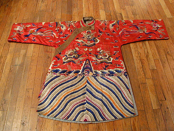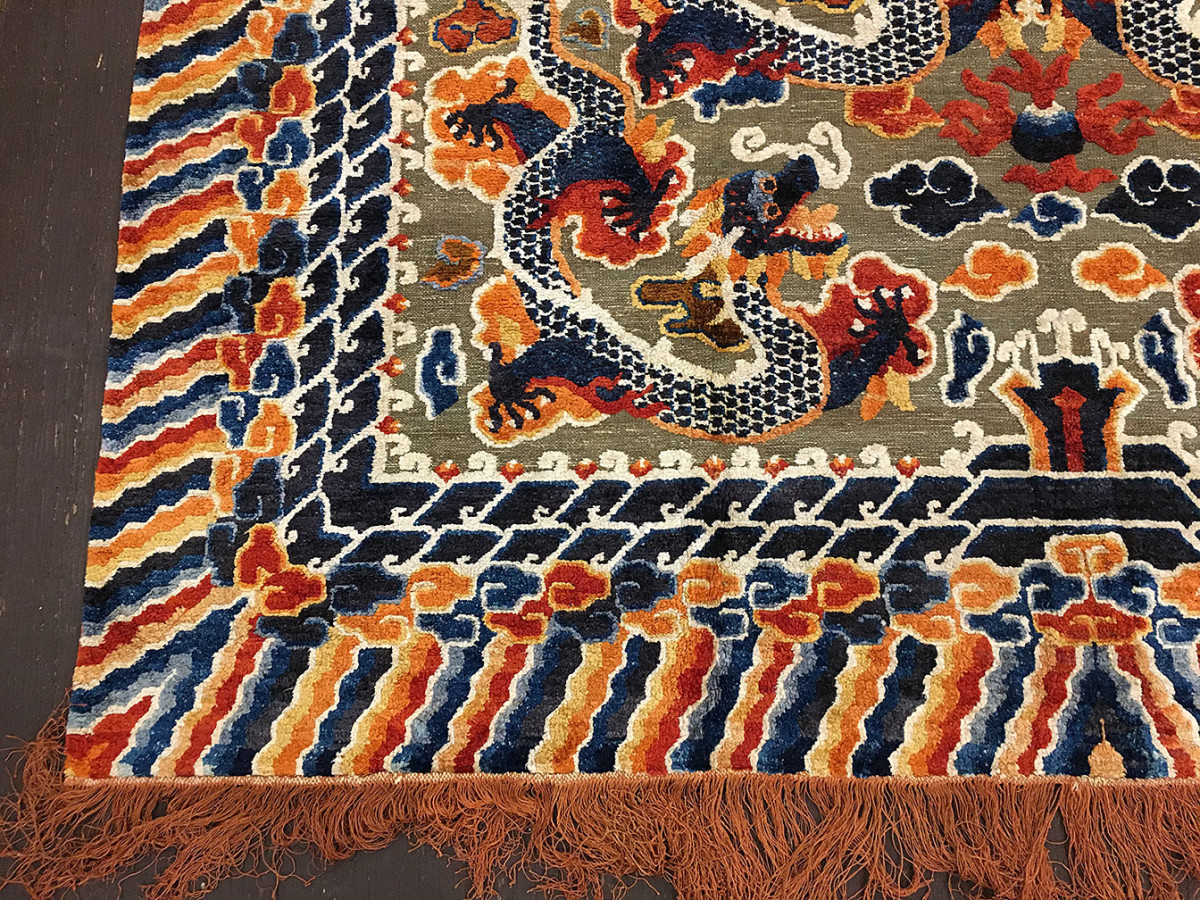 The rainbow border is a decorative element found in Chinese carpets, consisting of bands of multiple colors arranged in sequence, resembling a rainbow. This type of border is often used to frame the central field of the rug and reflects the Chinese preference for balanced color harmony and symbolic use of color. Rainbow borders add visual richness and are a distinctive feature in certain Chinese carpet designs. Rainbow Border is a term to describe certain borders in Chinese rugs that contains wavy stripes of different colors radiating from the edge of the field to the edge of the rug.