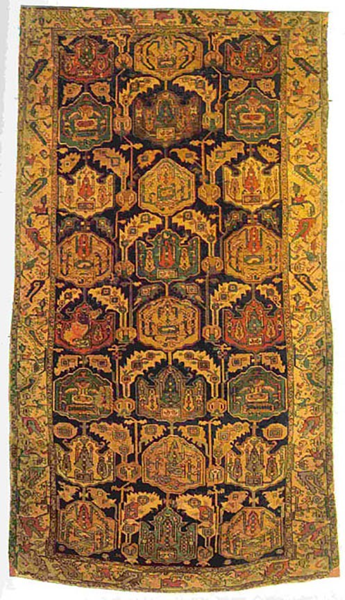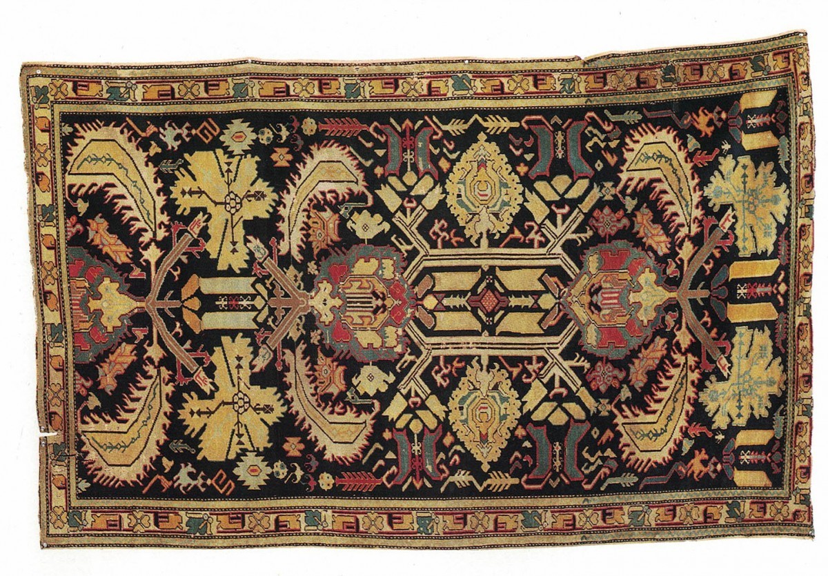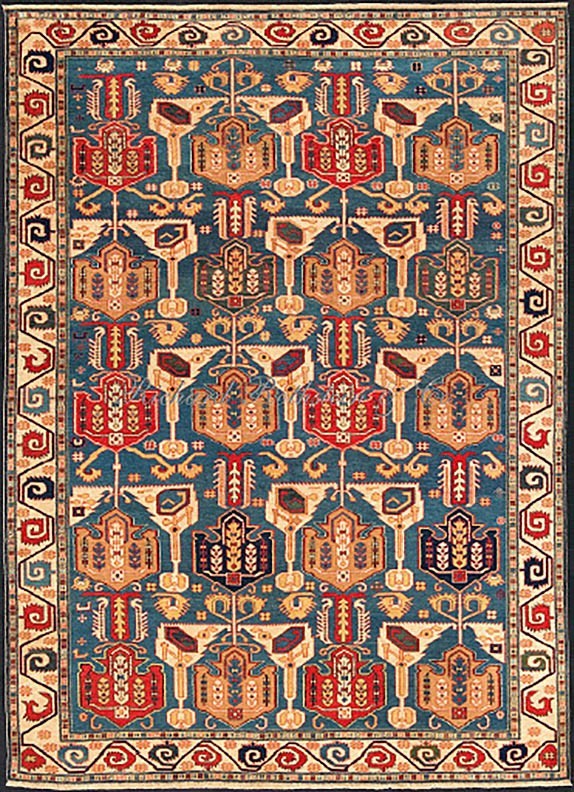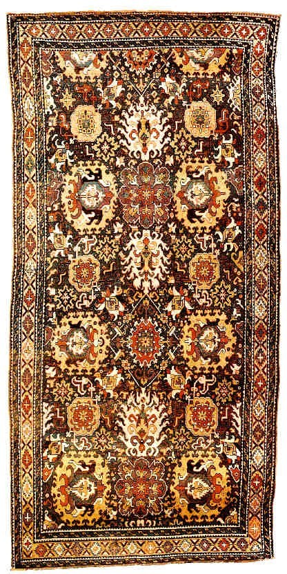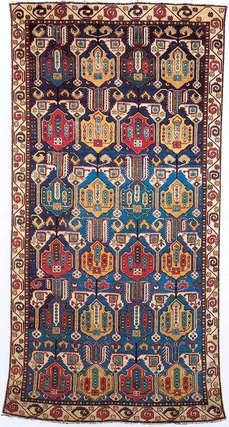 The so called "Shield Rugs" are a group of very finely woven south Caucasian rugs with an all over pattern of diagonally arranged shield shaped motifs with hooked extensions. Some scholars believe that the design was influenced by European culture of the era. Most of these rugs are Kazaks but few were woven in Shirvan, many with silk foundation.