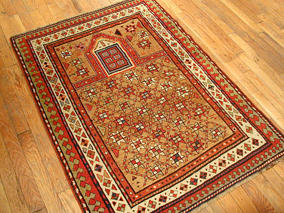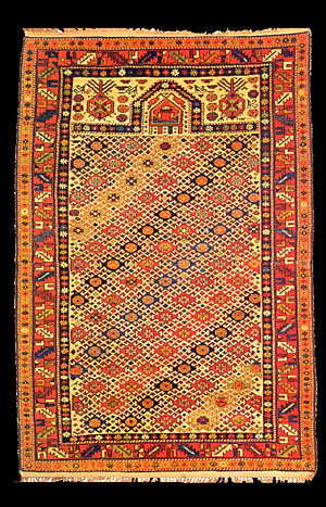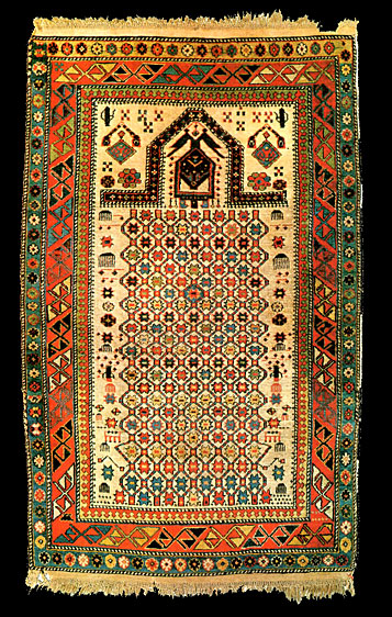 Eastward, along the shores of the Caspian Sea, the population was mainly Muslim and there was a large production of prayer rugs, often featuring diagonal lines of white across a dark colored ground.
