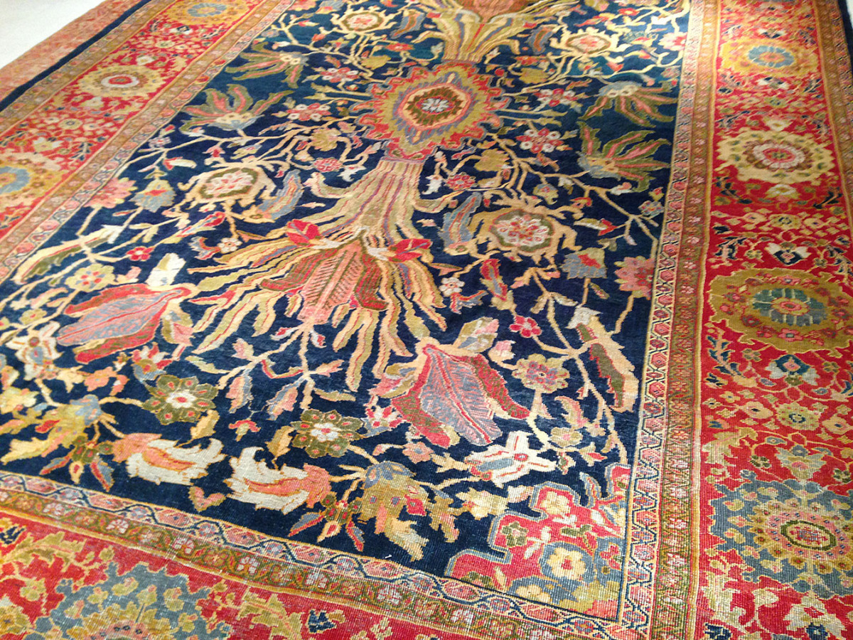 These carpets are known for their large-scale floral designs, open patterns, and soft color palettes, often produced for export markets in the late 19th century.