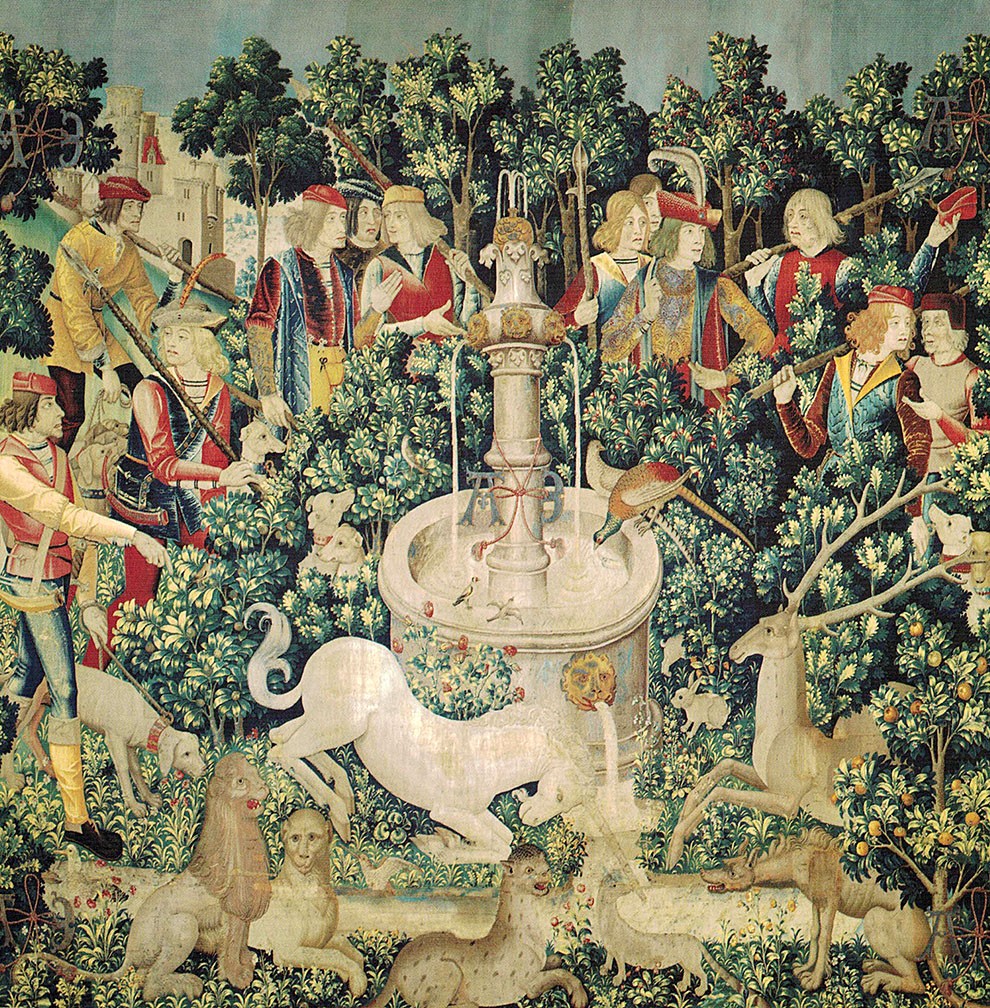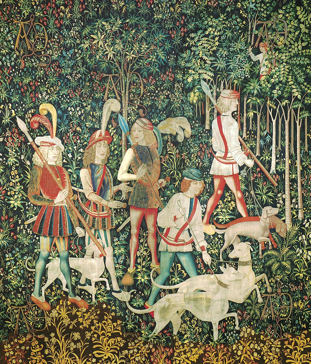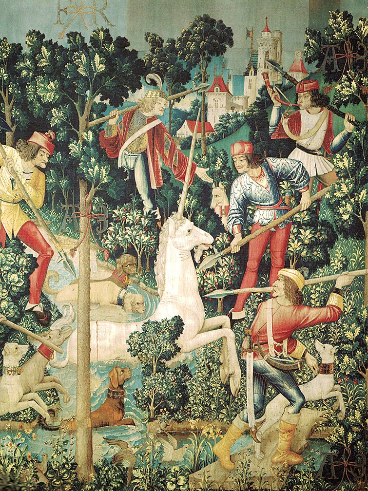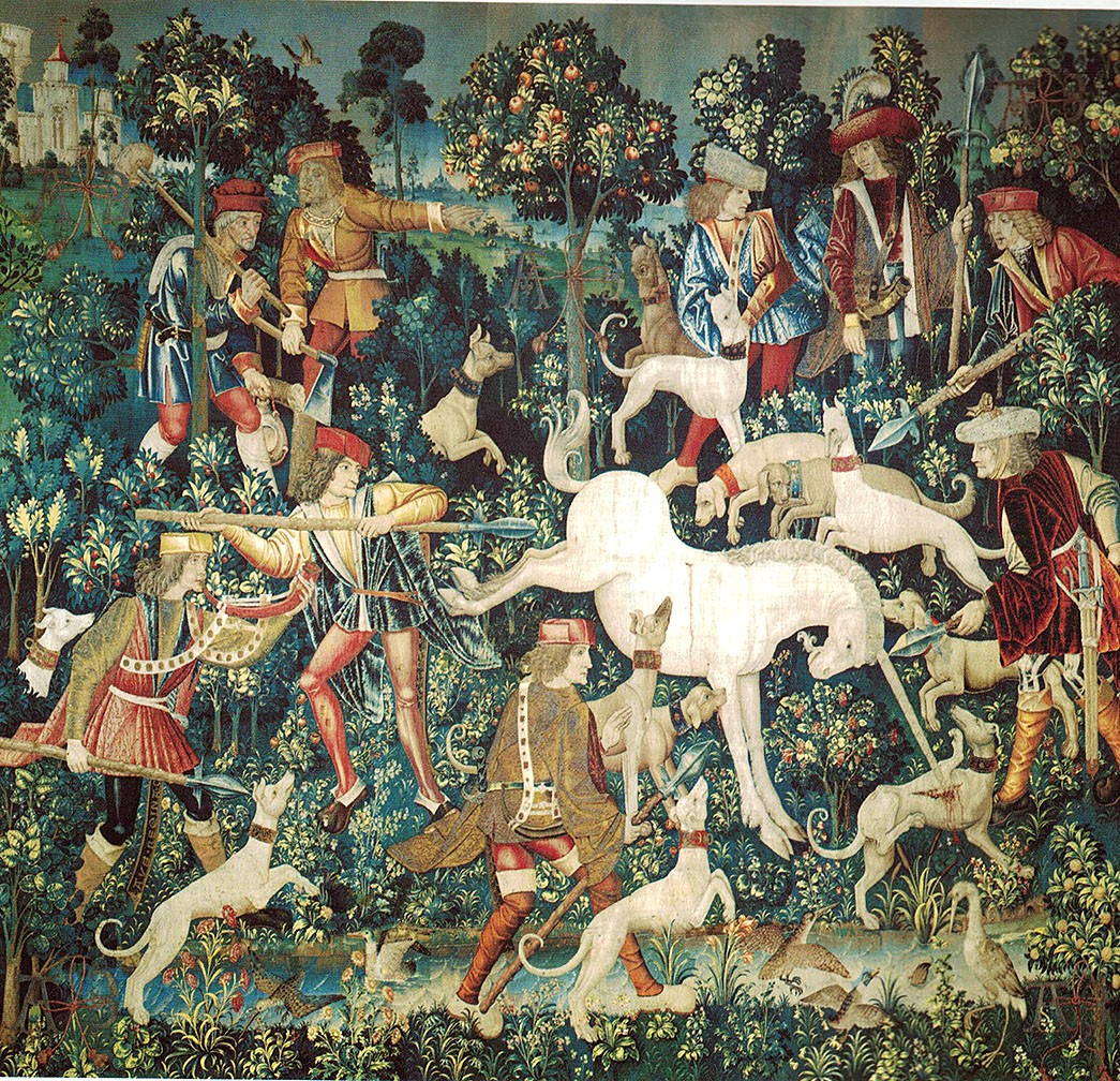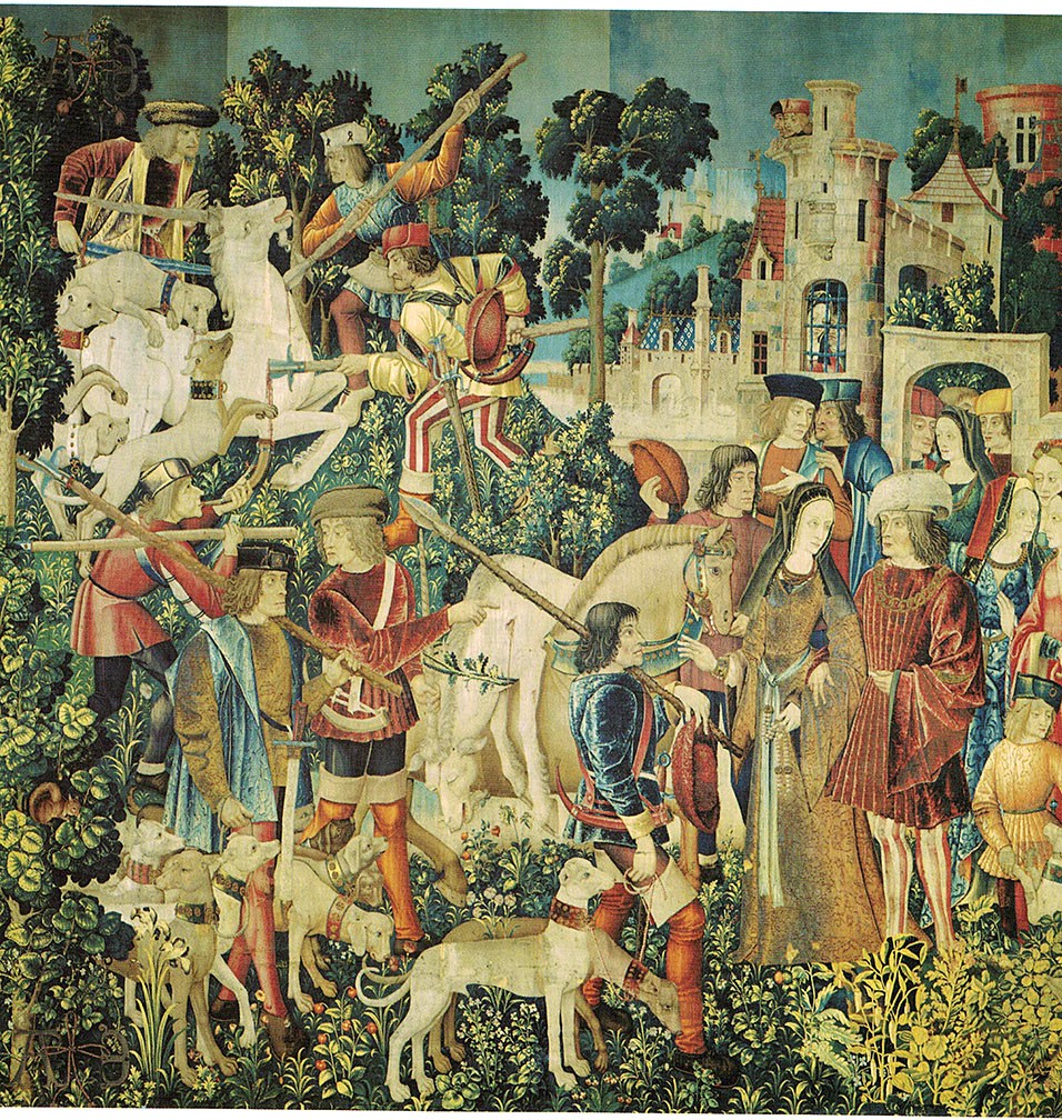 The Hunt of the Unicorn or the Unicorn Tapestries (French: La Chasse à la licorne) is a series of European tapestries dating from the late Middle Ages. This series of seven tapestries now in The Cloisters in New York was possibly made – or at least designed – in Paris at the turn of the sixteenth century. They are one of the canonical works of Late Middle Ages/Early Renaissance art and show a group of noblemen and hunters in pursuit of a unicorn through an idealised French landscape. The tapestries were woven in wool, metallic threads, and silk. The vibrant colours, still evident today, were produced from dye plants: weld (yellow), madder (red), and woad (blue). First recorded in 1680 in the Paris home of the Rochefoucauld family, the tapestries were looted at the French Revolution. Rediscovered in a barn in the 1850s, they were hung at the family's Château de Verteuil. Since then they have been the subject of intense scholarly debate about the meaning of their iconography, the identity of the artists who designed them, and the sequence in which they were meant to be hung. Although various theories have been put forward, as yet nothing is known of their early history or provenance, and their dramatic but conflicting narratives have inspired multiple readings, from chivalric to Christological. Variations in size, style, and composition suggest they come from more than one set, linked by their subject matter, provenance, and the mysterious AE monogram which appears in each. One of the panels, "The Mystic Capture of the Unicorn", survives as just two fragments. James J. Rorimer speculated in 1942 that the tapestries were commissioned by Anne of Brittany, to celebrate her marriage to Louis XII, King of France in 1499. Rorimer interpreted the A and E monogram that appears in each tapestry as the first and the last letters of Anne's name. Margaret B. Freeman, however, rejected this interpretation in her 1976 monograph, a conclusion repeated by Adolph S. Cavallo in his 1998 work. Tom Campbell, former Director of the Metropolitan Museum of Art, recently acknowledged that experts "still do not know for whom or where [the tapestries] were made." So far, scholarly efforts to explain the AE and other inscriptions, to identify the few heraldic symbols, and to coherently account for the puzzling narratives have met with limited success.