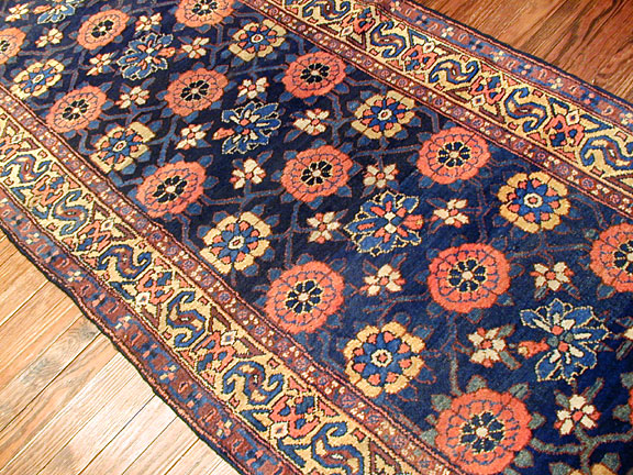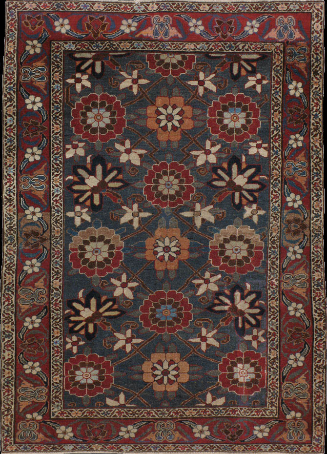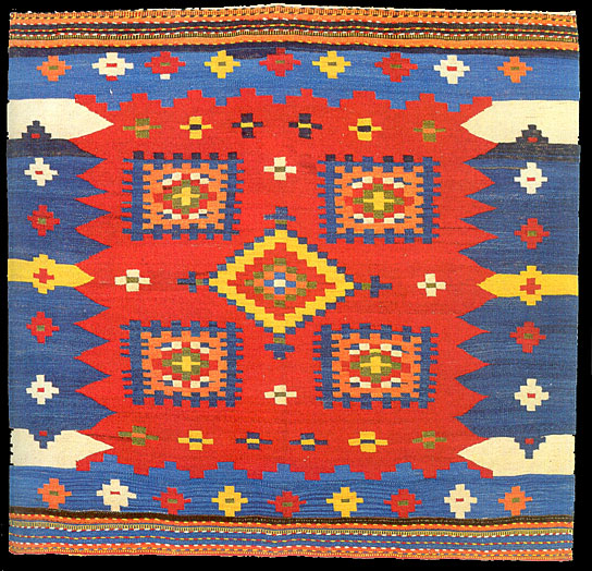 The dominant colors are dark blue, bright red, orange, and white, and the main design is a repeating interlaced daisy pattern, the so called Mina Khani.