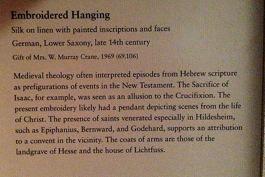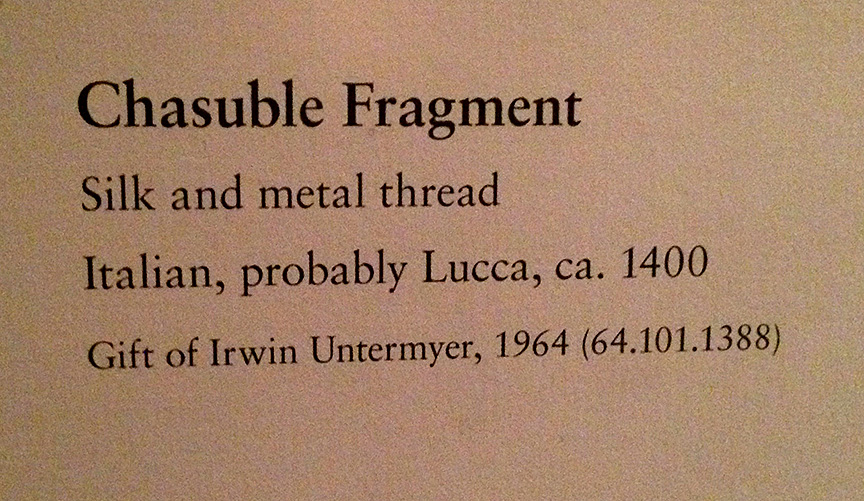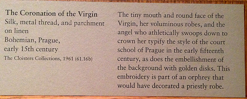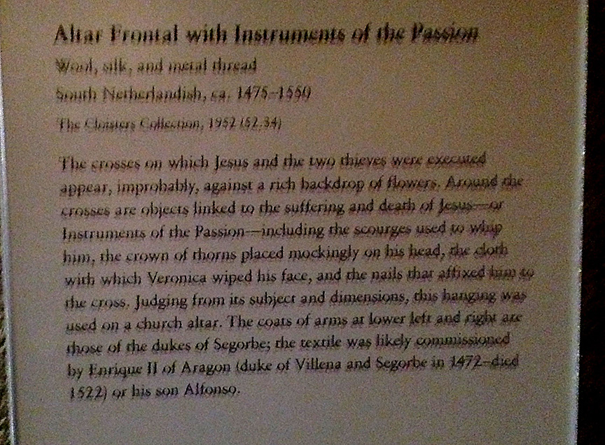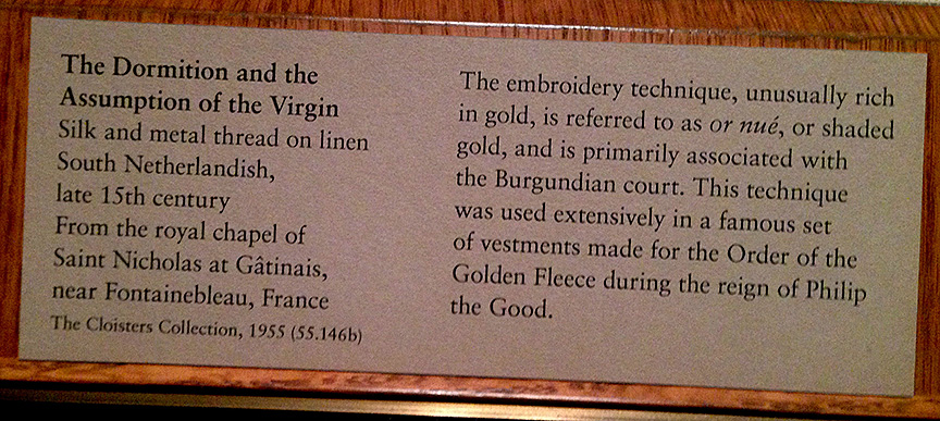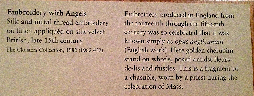 The Cloisters museum and gardens, the branch of The Metropolitan Museum of Art devoted to the art and architecture of medieval Europe, was assembled from architectural elements, both domestic and religious, that largely date from the twelfth through the fifteenth century.